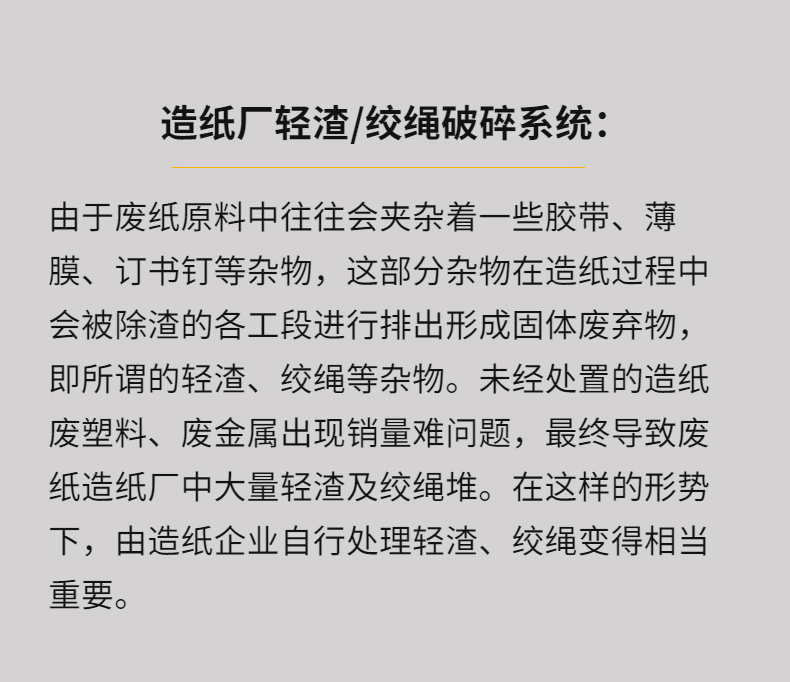 專業(yè)針對(duì)紙廠輕渣,絞繩等廢棄物而設(shè)計(jì),整機(jī)技術(shù)來(lái)源于歐洲,采用微電腦(PC)自動(dòng)控制,設(shè)啟動(dòng)、停止、反轉(zhuǎn)及超載自動(dòng)反轉(zhuǎn)控制功能,具有低速、大轉(zhuǎn)矩、低噪音等特點(diǎn),軸承座采用對(duì)開(kāi)型式,拆裝換刀容易方便適合撕碎特大、特厚難碎物料。