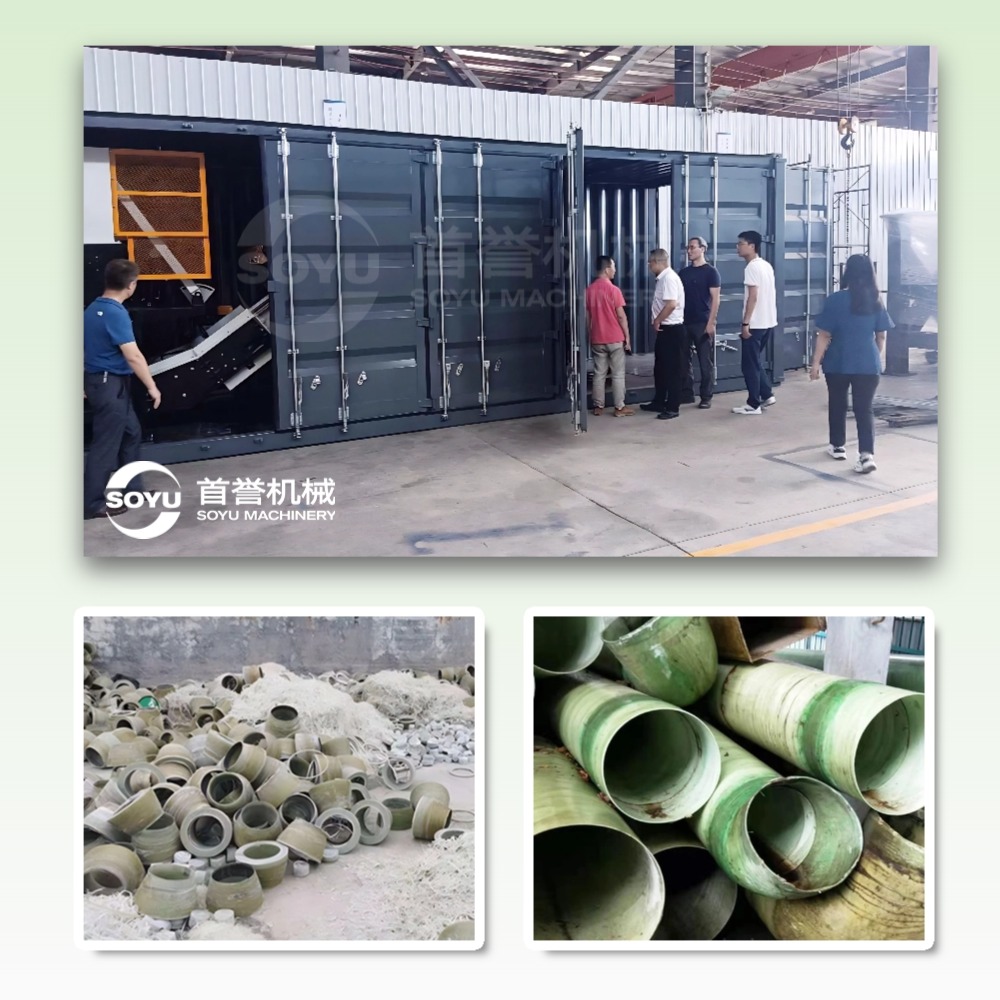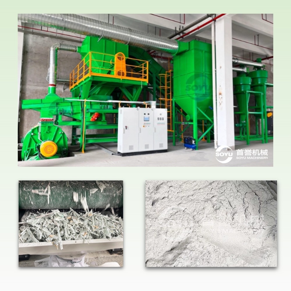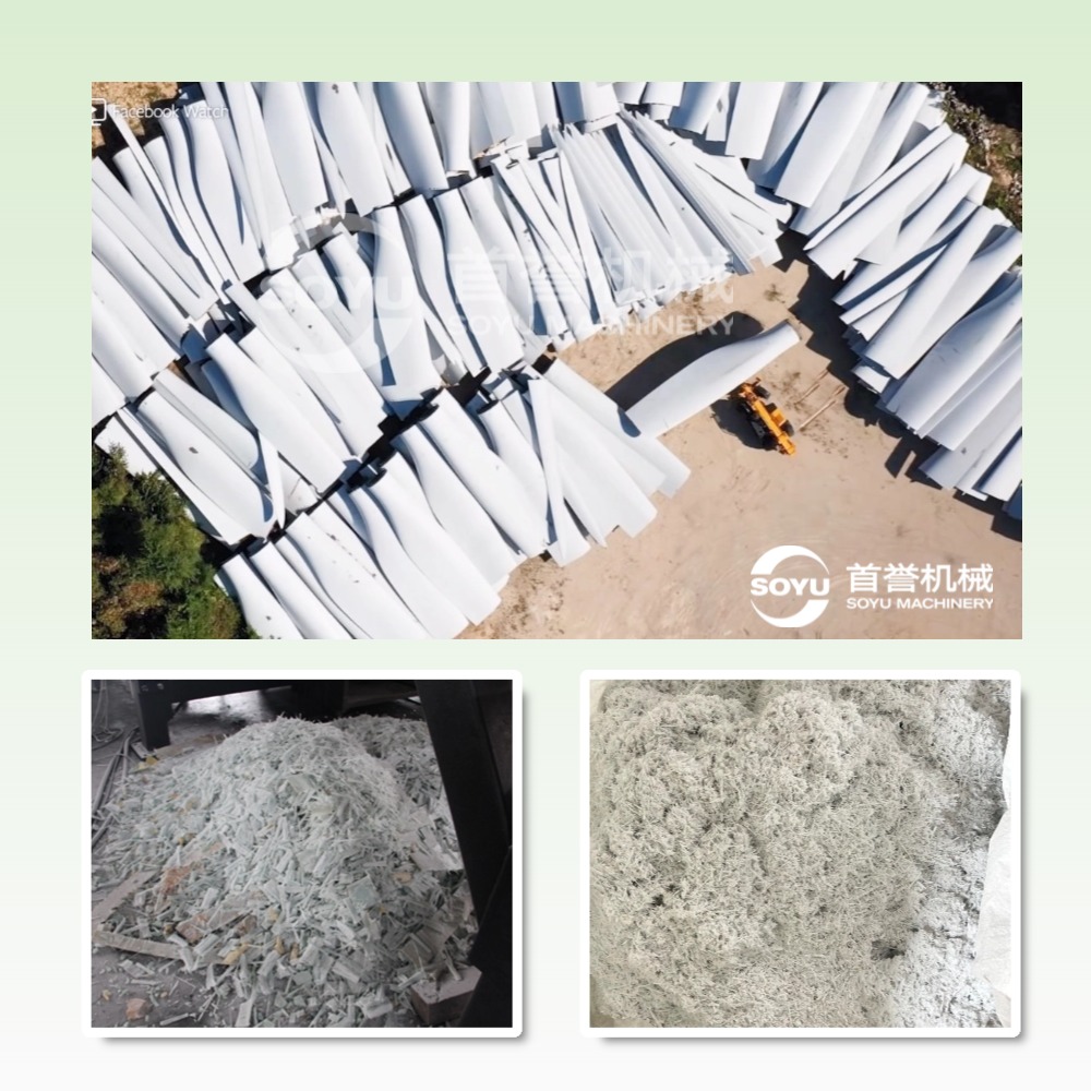 三、技術(shù)突破:智能化與精細化并行 1. 設備升級 -首譽機械研發(fā)的退役風電葉片玻璃鋼制品資源化處置系統(tǒng)等新型裝備,通過增加破碎維度,將出料粒度控制在 200目 以內(nèi),滿足高端復合材料再生需求。