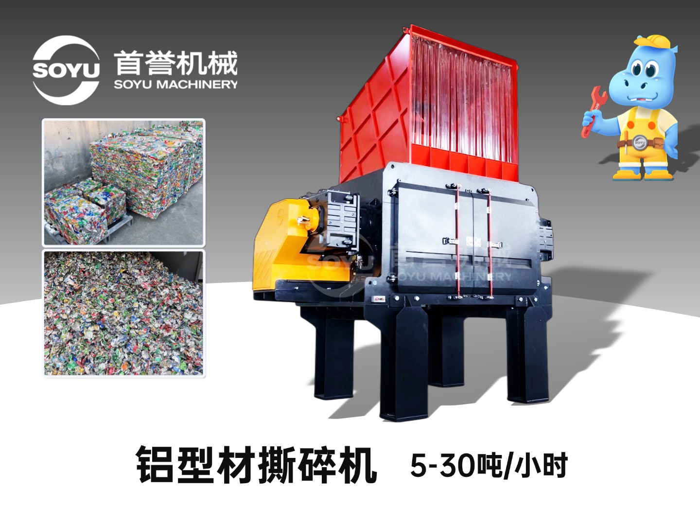 首譽機(jī)械的鋁型材撕碎機(jī)具有諸多顯著特點。智能液壓驅(qū)動,適配性強(qiáng),搭載進(jìn)口液壓驅(qū)動系統(tǒng),可根據(jù)壓實包易拉罐、棉花包鋁型材、壓實包鋁型材等不同特性,自動調(diào)節(jié)輸出轉(zhuǎn)速與扭矩,調(diào)節(jié)精度達(dá) ±5RPM,實現(xiàn) 物料適配型 破碎,避免一刀切導(dǎo)致的損耗或卡料,響應(yīng)速度比國產(chǎn)系統(tǒng)提升 40%。